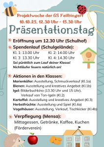 In diesem Jahr findet vom 8.-10.10.2025 unsere Projektwoche statt. Es wird geforscht, gewerkelt, gespielt, gebastelt, gebacken, geerntet und gemalt.